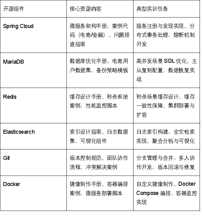 资源包将持续更新,紧跟开源技术版本迭代与产业应用趋势,如Spring Cloud新版本功能、Docker与K8s协同应用等内容,确保实训资源的时效性与实用性。