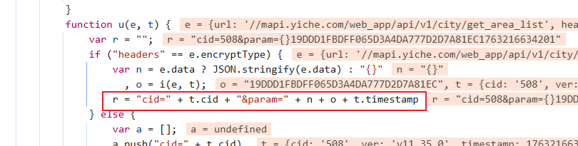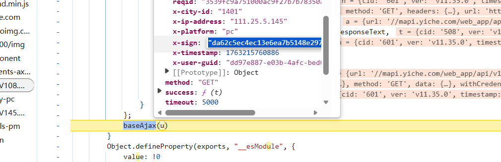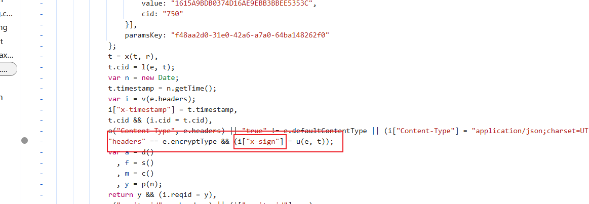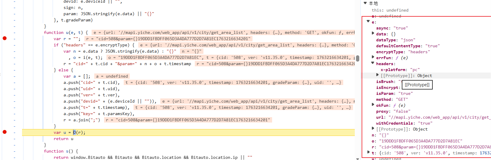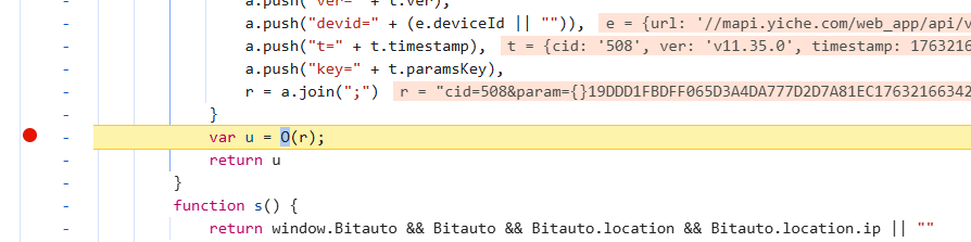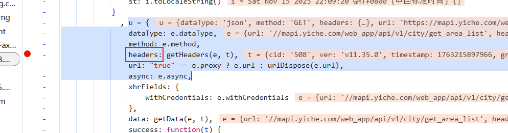 继续找赋值的位置,现在有了headers,赋值有可能通过headers['xxx'] = xxx来赋值,但是找了并没有,后来我发现可以从返回值入手,这个u里面有加密参数: