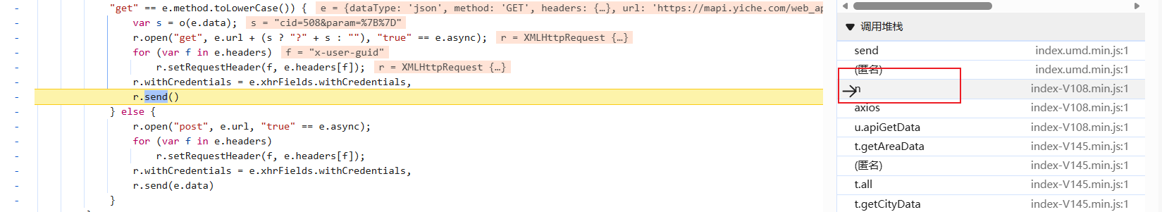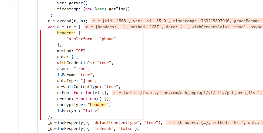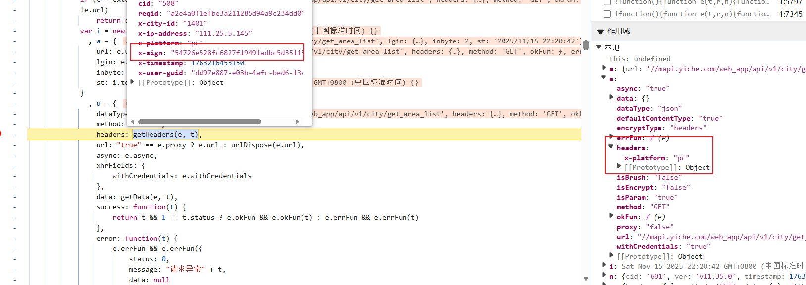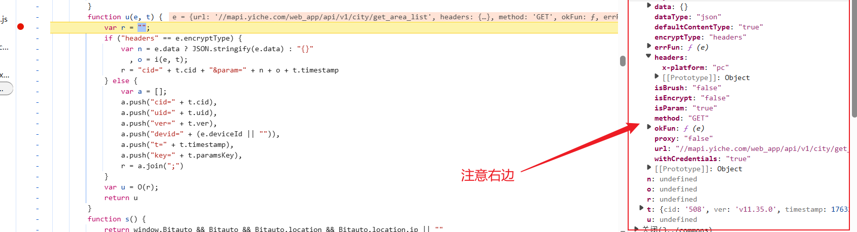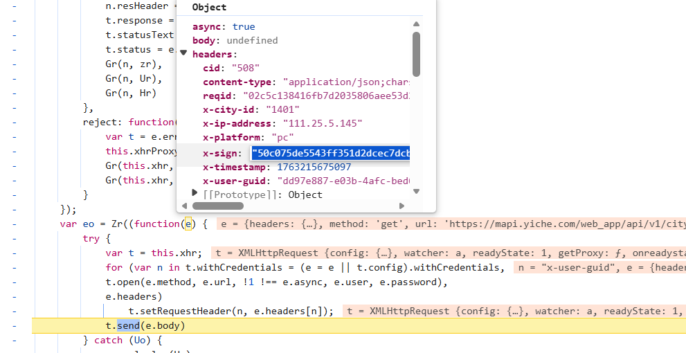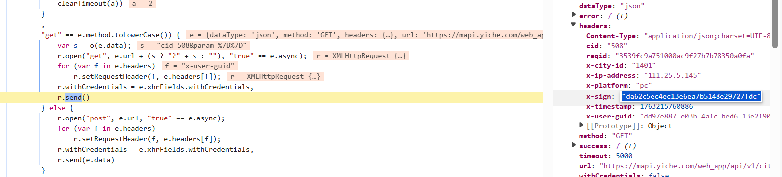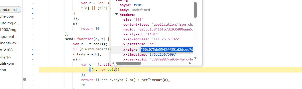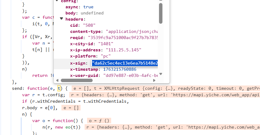 发现此栈是密文,但是前一个栈就是没密文的状态,那很可能就是在上一个栈加密的,咱们不能只看入参和返回值了,需要看一下上一个栈内容中是否有加密参数,这里有一个headers的Object,但是并没有加密参数x-sign: