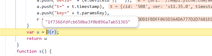 右侧还没有,有经验的应该就知道大概率加密就是O函数进行的,因为运行完这行代码就要返回出值了,返回的值带有密文,而这行就是最后的机会,鼠标放上看一下: