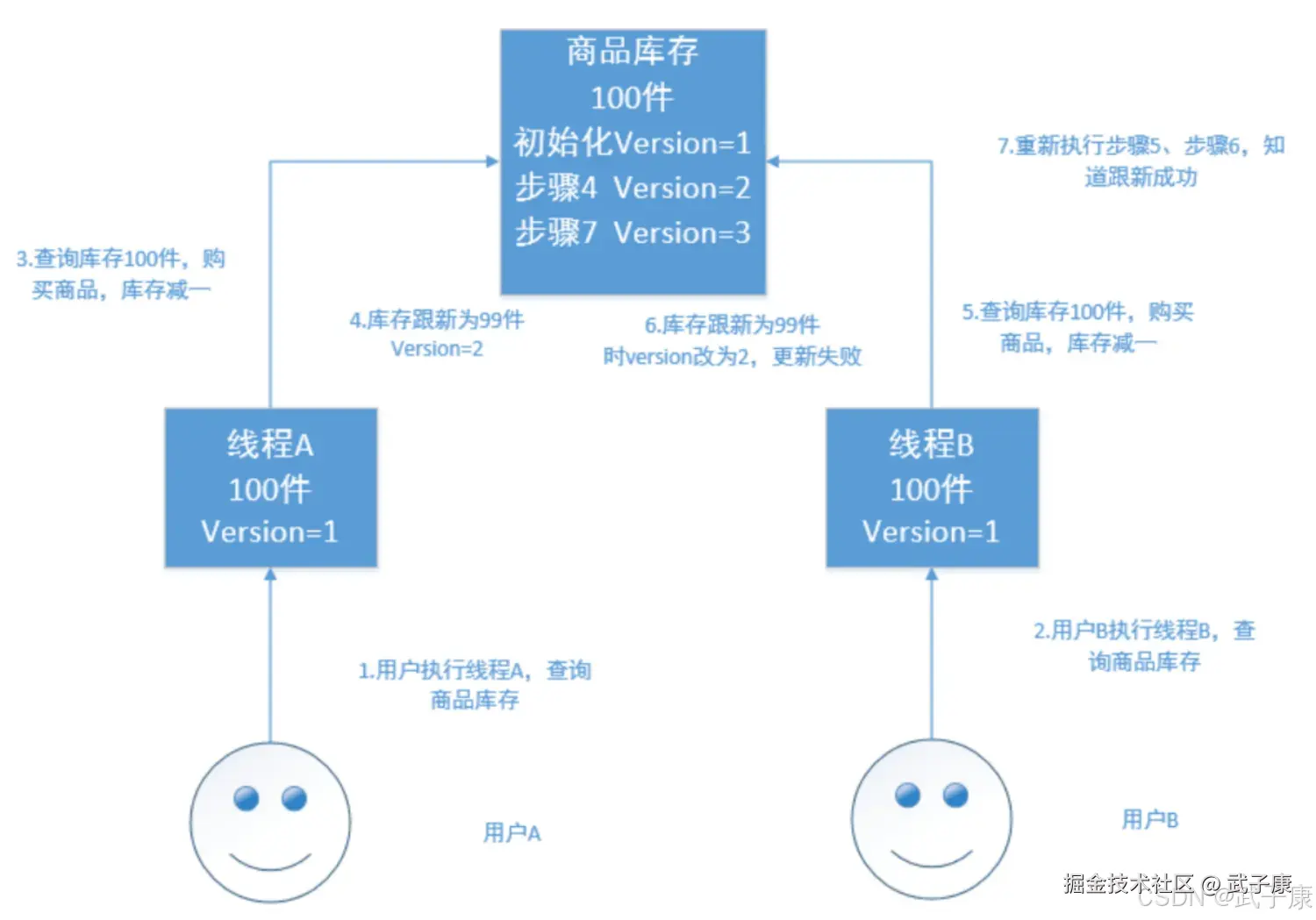 如果是多线程操作,就可能有多个线程并发的去执行上述的3步骤流程,假如此时有两个人都来读取商品数据,两个线程并发的服务于两个人,同时在进行商品库存数据的修改,假设库存为100件,正确的情况:线程A将库存-1,设置为99件,线程B读取99再-1,设置为98件。但是如果A和B都是读取的99件,那么后续就会出现数量错误的问题。