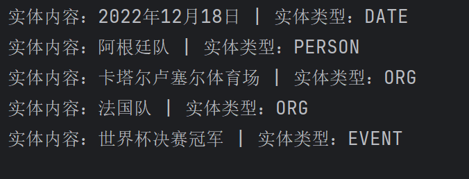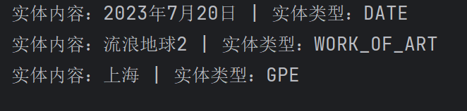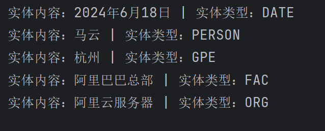 print(f"实体内容:{ent.text} | 实体类型:{ent.label_}")