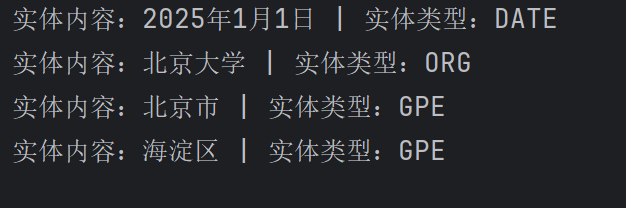 text = "2025年1月1日,北京大学在北京市海淀区举办了人工智能学术研讨会"