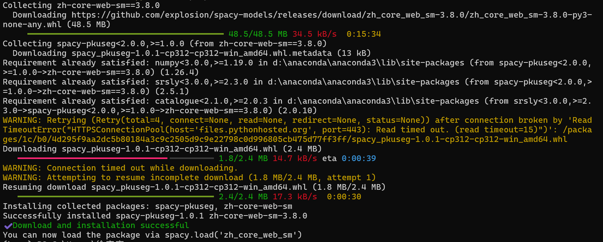 首先安装中文模型"zh_core_web_sm",方法如下: