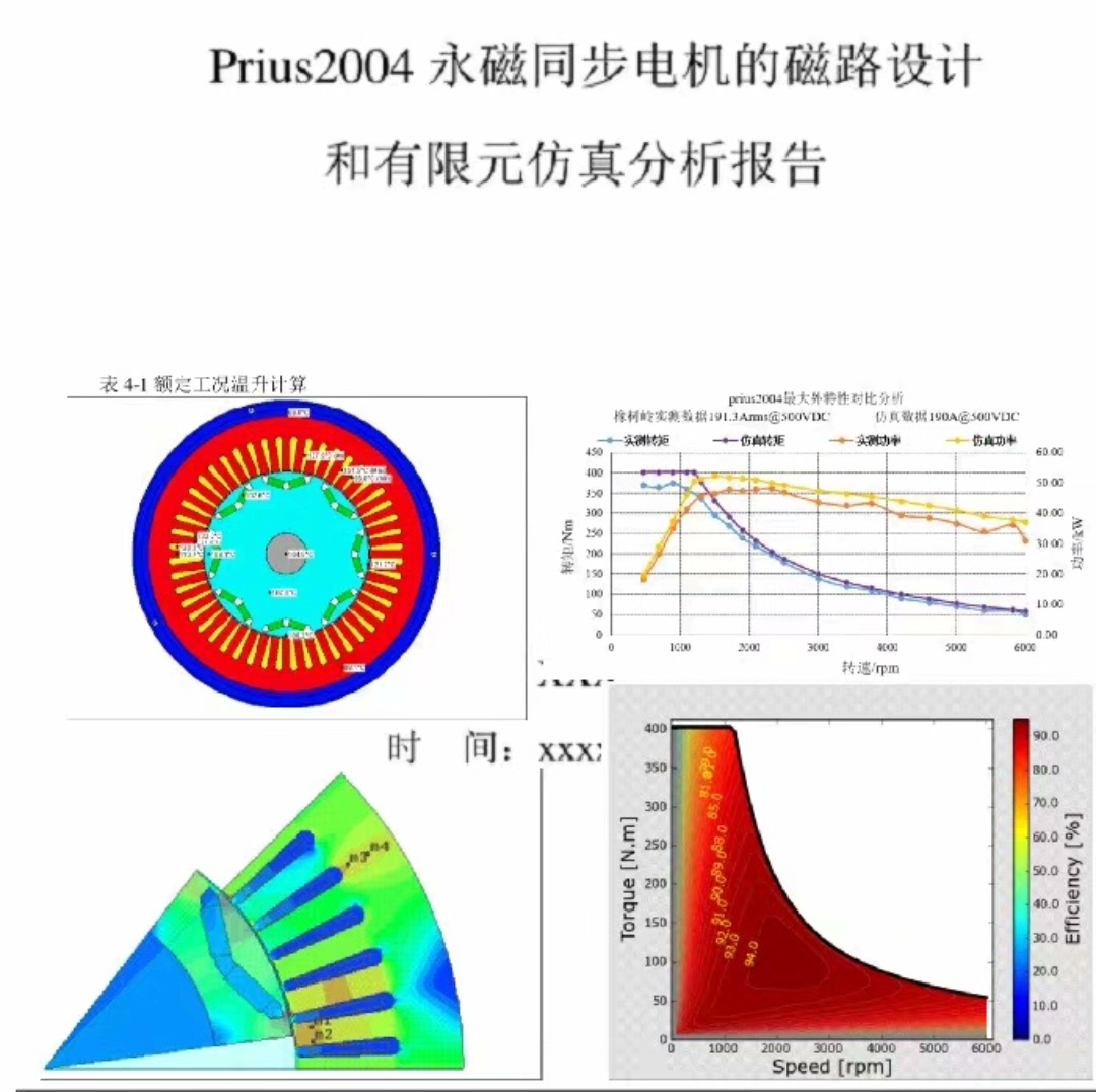 Prius2004永磁同步电机设计报告: 磁路法、maxwell有限元法、MotorCAD温仿真、应力分析。 (内容比较完善,用于很需要的朋友,不支持讲解,等额外服务哈。 ) 内容:: 1.Excell设计程序,可以了解这个电机是怎么设计出来的,已知功率转矩等,计算电机的体积,叠厚,匝数等。 2.Maxwell参数化仿真模型:可以学习参数化仿真模型,有限元结果可查看。 3. 橡树岭拆解和实测数据:官方的实测数据和差拆解报告。 4.maxwell prius2004建模仿真教程等:ppt资料一步一步教学怎么去建模 5.温升仿真分析,提供motor cad模型a21