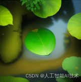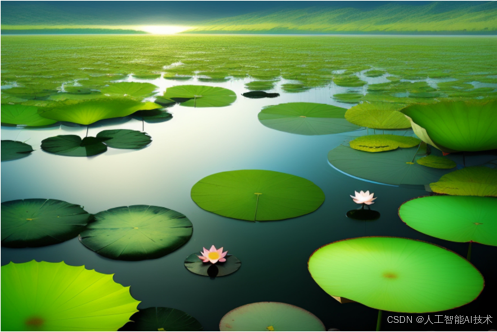 在大多数情况下,我们并不需要写很长的段落,只需要关键词即可,也不需要过于注重语法。例如,我们将之前的那段话提炼为"荷叶,绿色,湖面",生成的图像效果也相差无几,如下图所示。
