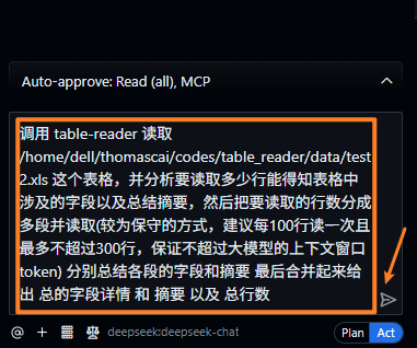 提示词要引导大模型"分批读取表格数据",避免一次性让模型处理过大的数据量。若一次输入接近或超过模型上下文窗口,极容易触发报错,并导致 MCP 客户端直接崩溃。