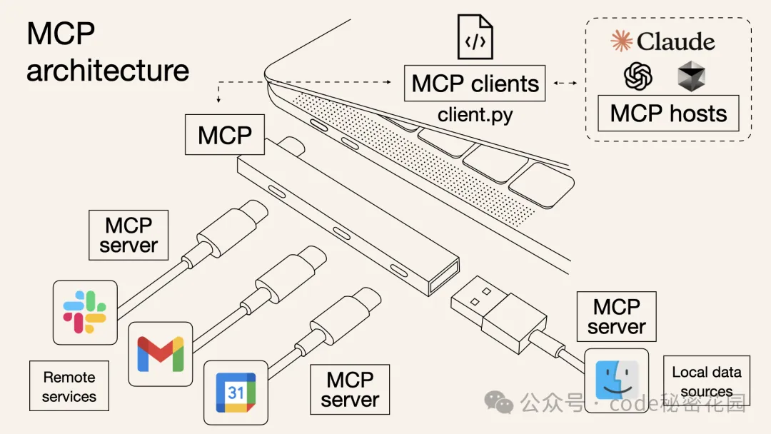 MCP 的解决思路:MCP像是一个 "通用插头" 或者 "USB 接口",制定了统一的规范,不管是连接数据库、第三方 API,还是本地文件等各种外部资源,都可以通过这个 "通用接口" 来完成,让 AI 模型与外部工具或数据源之间的交互更加标准化、可复用。