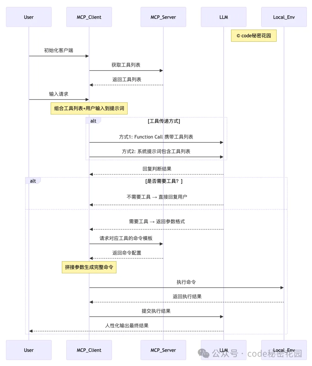 工具命令生成与执行 若需要工具,MCP 客户端根据 LLM 提供的参数格式,以及 MCP Server 配置的命令模板进行拼接,生成完整的可执行命令,并在本地环境(Local_Env)中执行该命令。