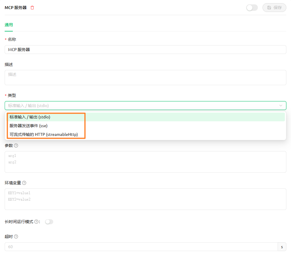 我们使用 Cherry Studio 中的 MCP 服务配置来举例,最前面的名称和描述比较好理解,都是用于展示的。