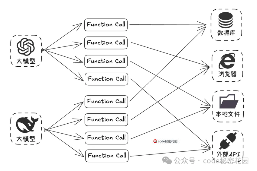 (2)OPEN AI 最开始提出这项技术的时候,并没有想让它成为一项标准,所以虽然后续很多模型也支持了 Function Call 的调用,但是各自实现的方式都不太一样。如果我们要发开一个 Function Call 工具,需要对不同的模型进行适配,比如参数格式、触发逻辑、返回结构等等,这个成本是非常高的。