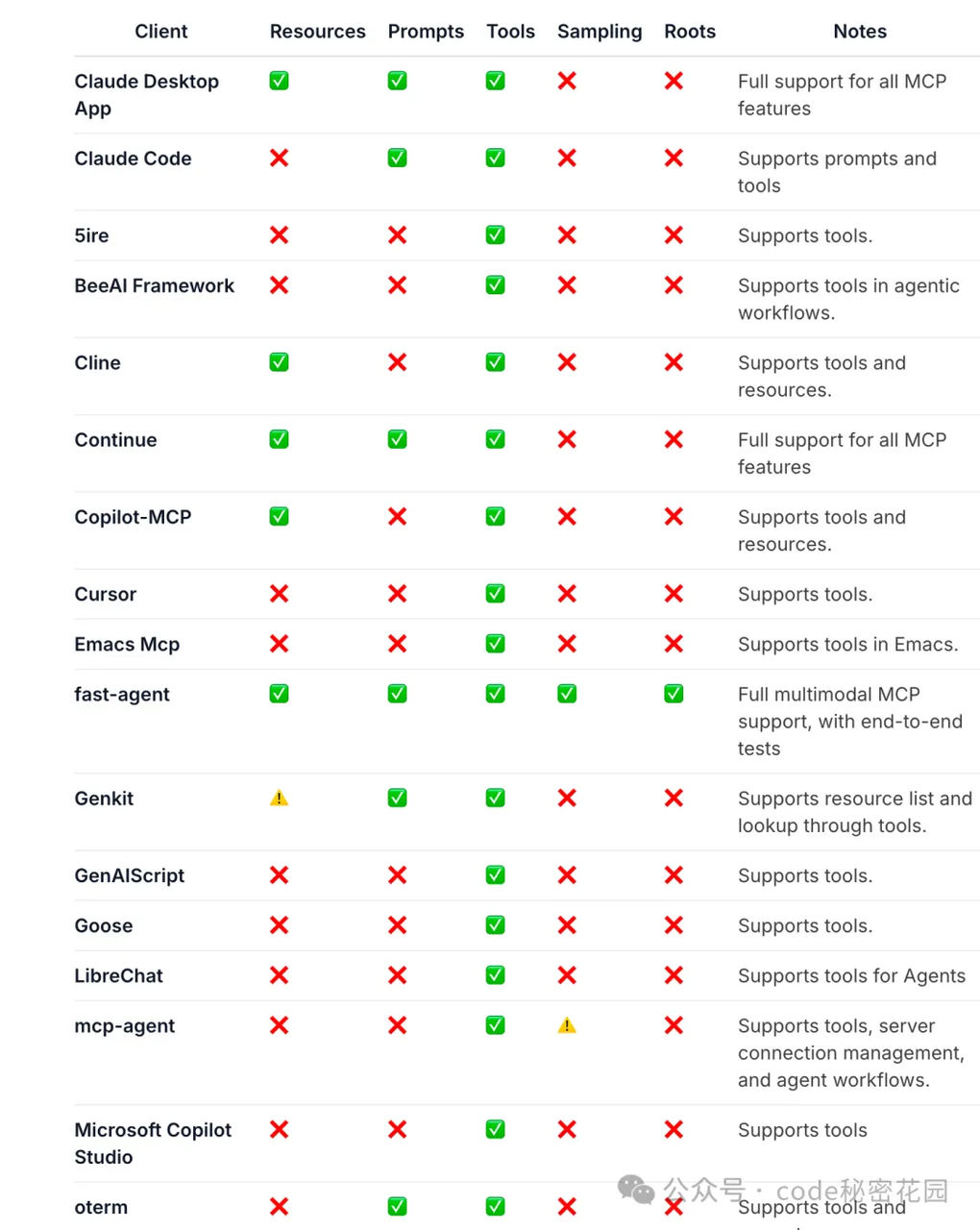 在 MCP 官方文档中,我们看到已经支持了 MCP 协议的一些客户端/工具列表: