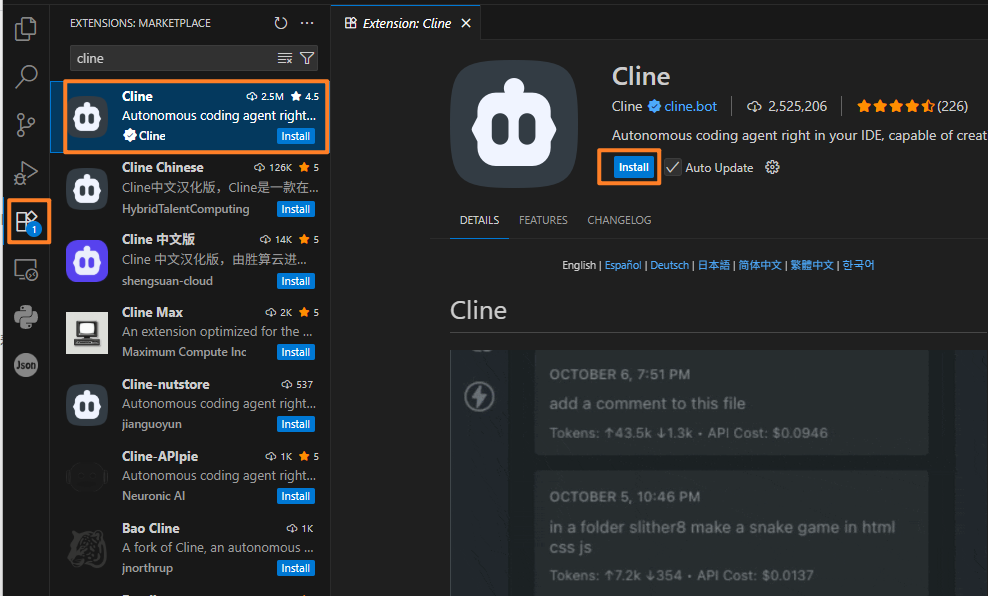 在 VsCode 插件市场搜索,Cline 找到后点击安装即可(注意这里还有很多非官方的版本,直接安装那个下载量最大的就好):