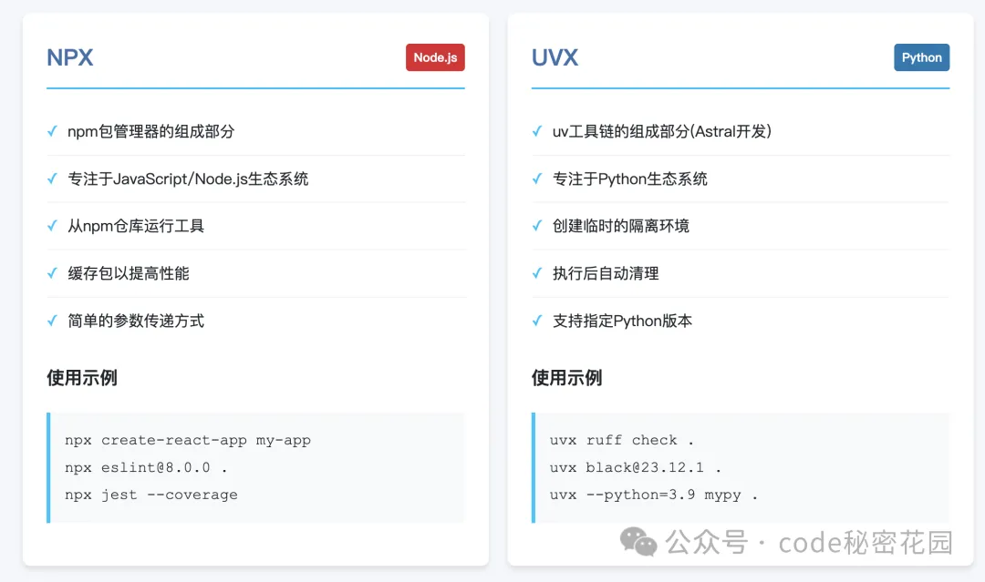 | 使用场景 | 项目依赖管理 | 快速执行脚手架或工具命令 |