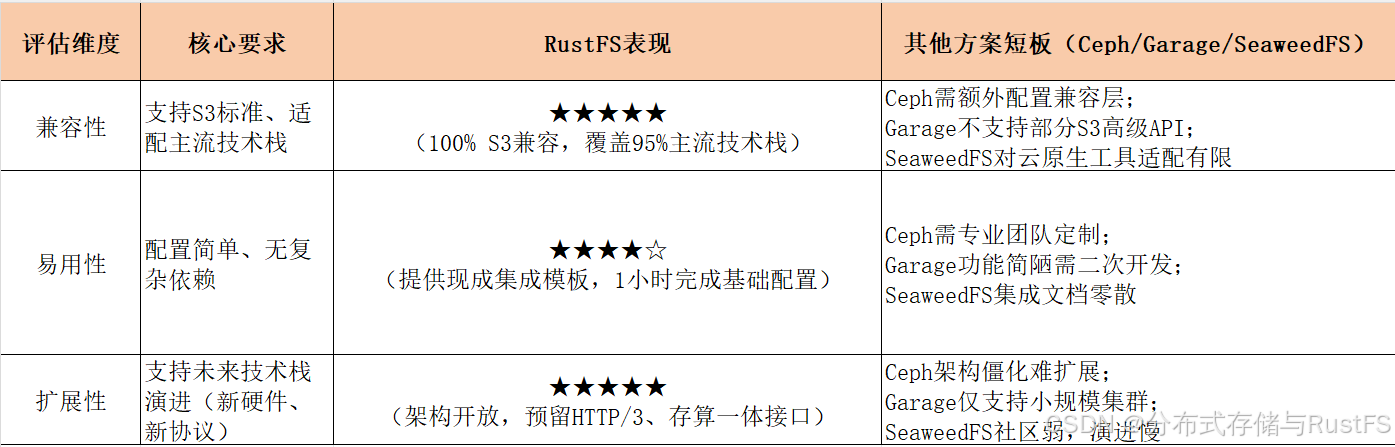 选存储的集成方案,不用纠结"功能多全",重点看3个落地维度,RustFS的适配性在这三点上均处于第一梯队: