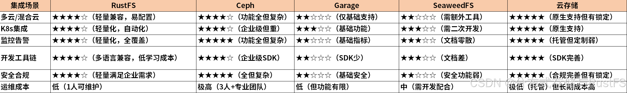不用再纠结多方案对比,一张表看清RustFS的集成优势: