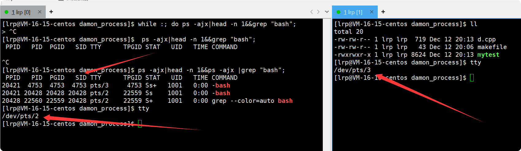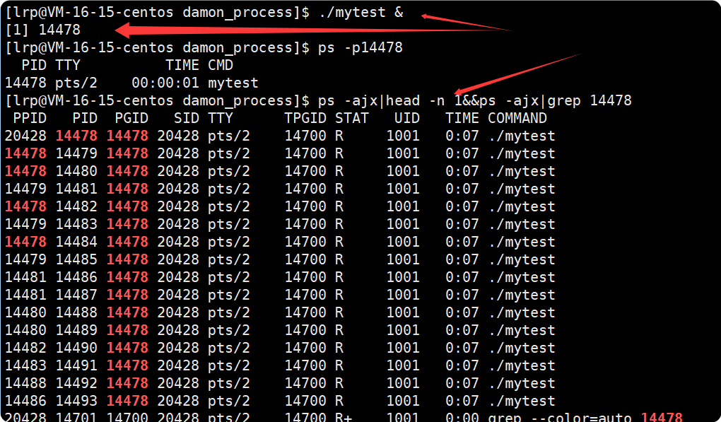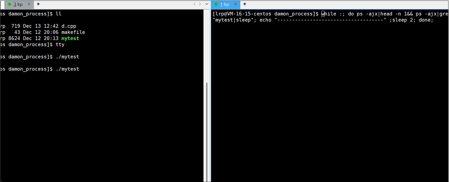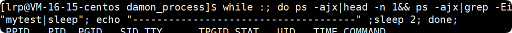 [lrp@VM-16-15-centos damon_process]$ while :; do ps -ajx|head -n 1&& ps -ajx|grep -Ei "mytest|sleep"; echo "-------------------------------------" ;sleep 2; done;