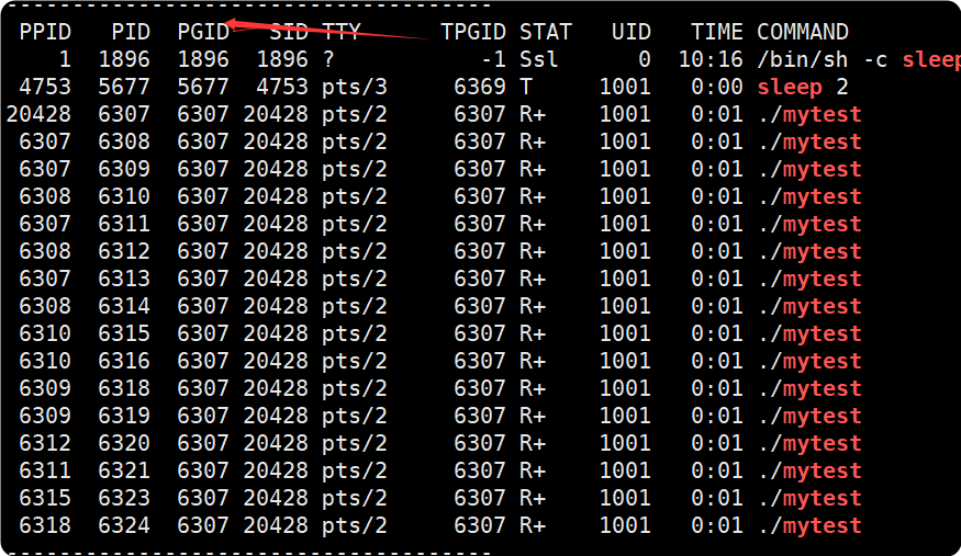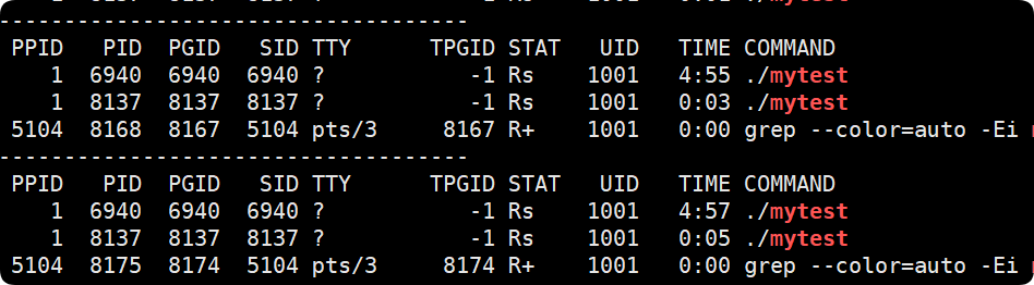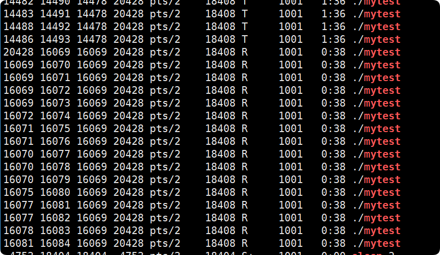 14479 14481 14478 20428 pts/2 18519 T 1001 1:36 ./mytest
