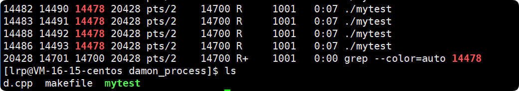 14478 14479 14478 20428 pts/2 18519 T 1001 1:36 ./mytest