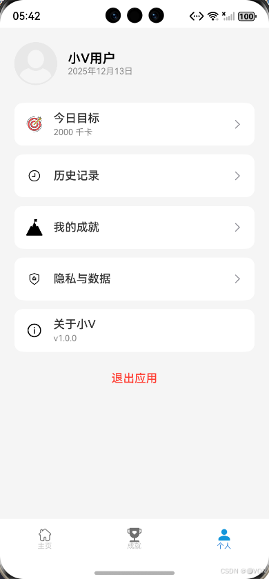 在「小V健身助手」的开发进程中,我们始终坚持组件化、一致性与轻量化 三大原则。继首页、成就页之后,我们以同样的架构思想,构建了名为 PersonContent 的个人中心视图组件------它不是独立页面,而是可嵌入、可复用、风格统一的 UI 模块。