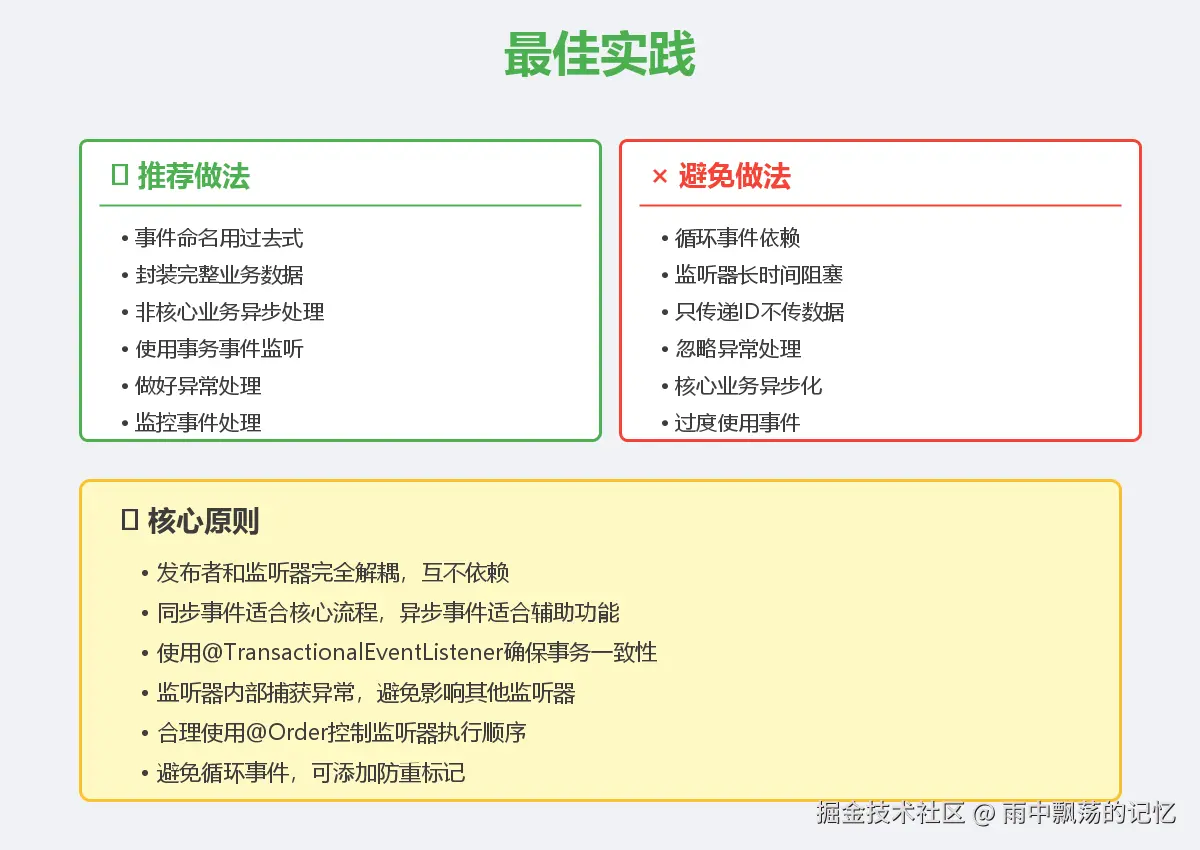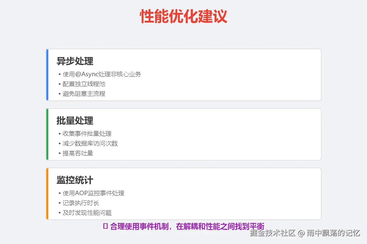 Spring事件机制是一个强大的解耦工具,合理使用能够显著提升代码的可维护性和扩展性。