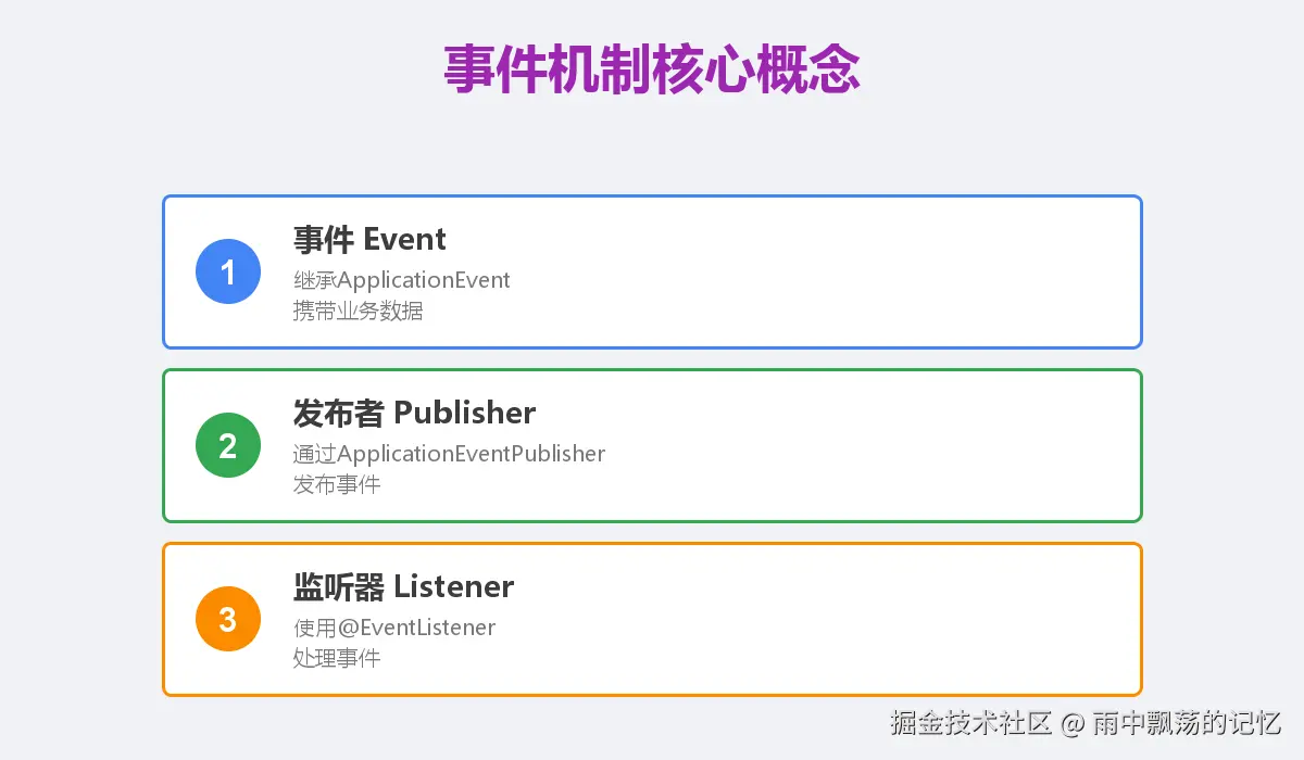 Spring事件机制基于观察者模式,包含三个核心角色: