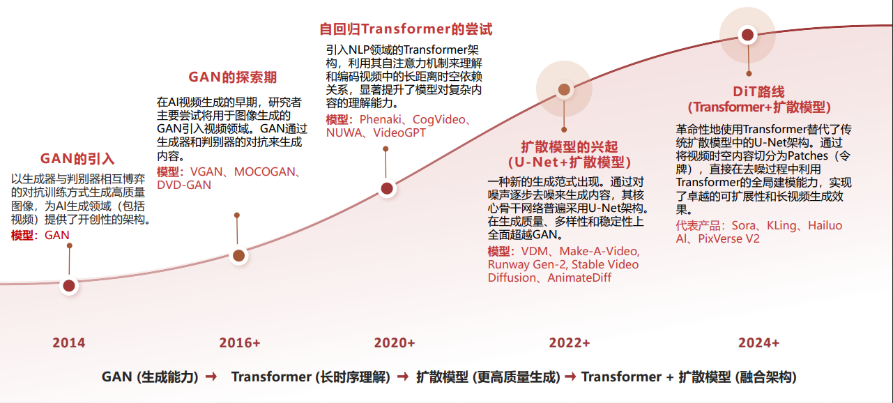 AI视频生成的技术范式经历了多轮迭代,从简单的图像拼接逐步发展为基于复杂模型的智能生成,每一次范式升级都带来生成质量和能力的飞跃。