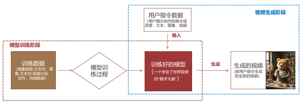 - 模型训练:通过深度学习算法,让模型在预处理后的数据集上学习视觉规律、时空关系和物理逻辑,形成具备生成能力的"数字大脑"。