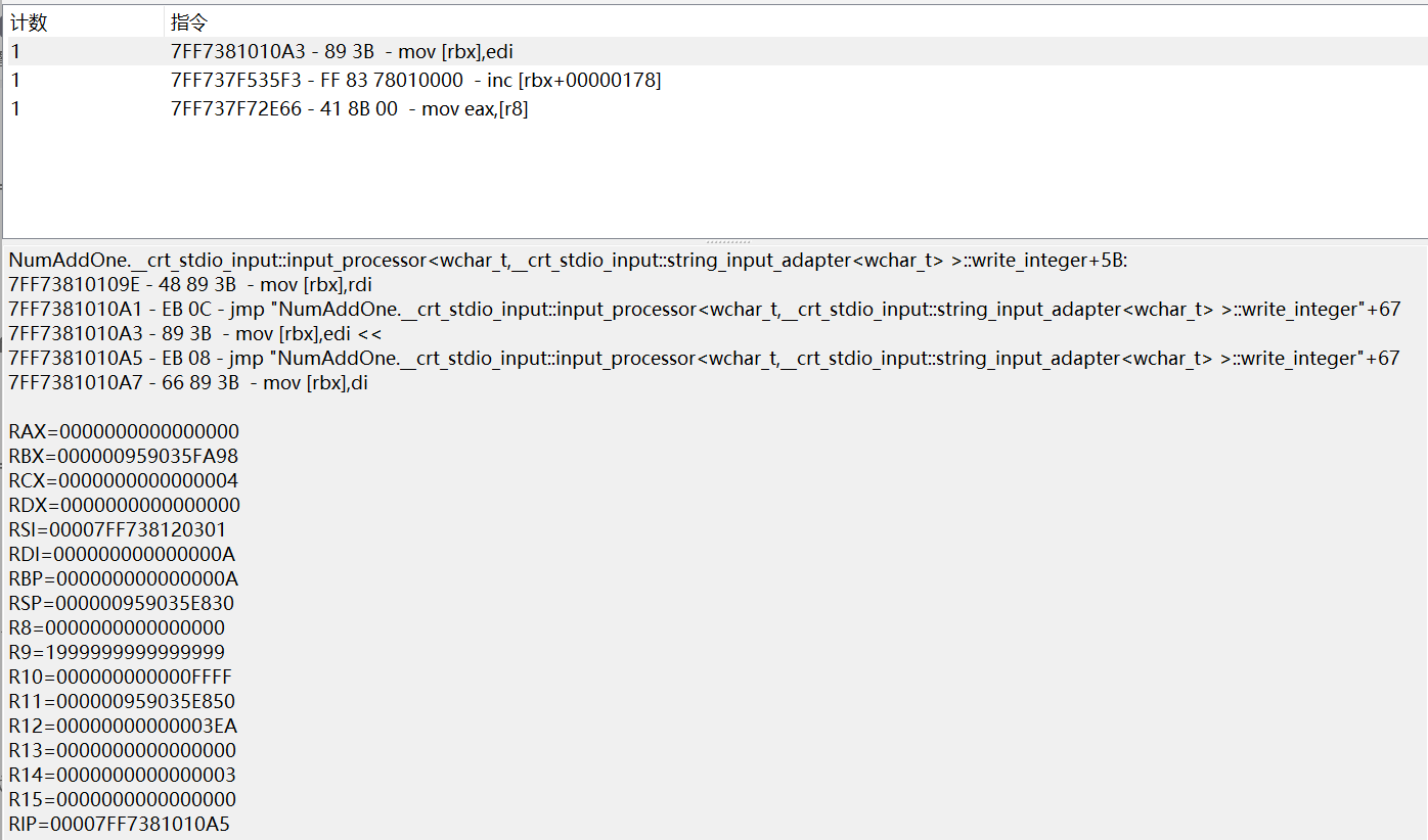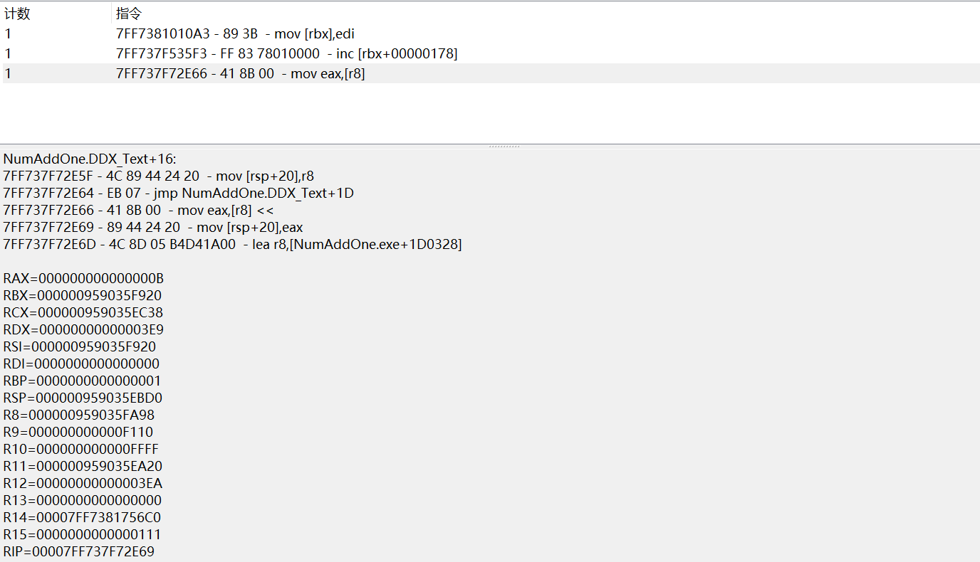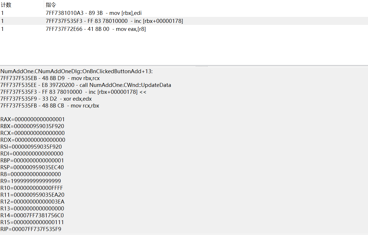 | B | 7FF737F535F3 | FF 83 78010000 inc [rbx+0x178] | m_nNum += 1; | 第2步 |