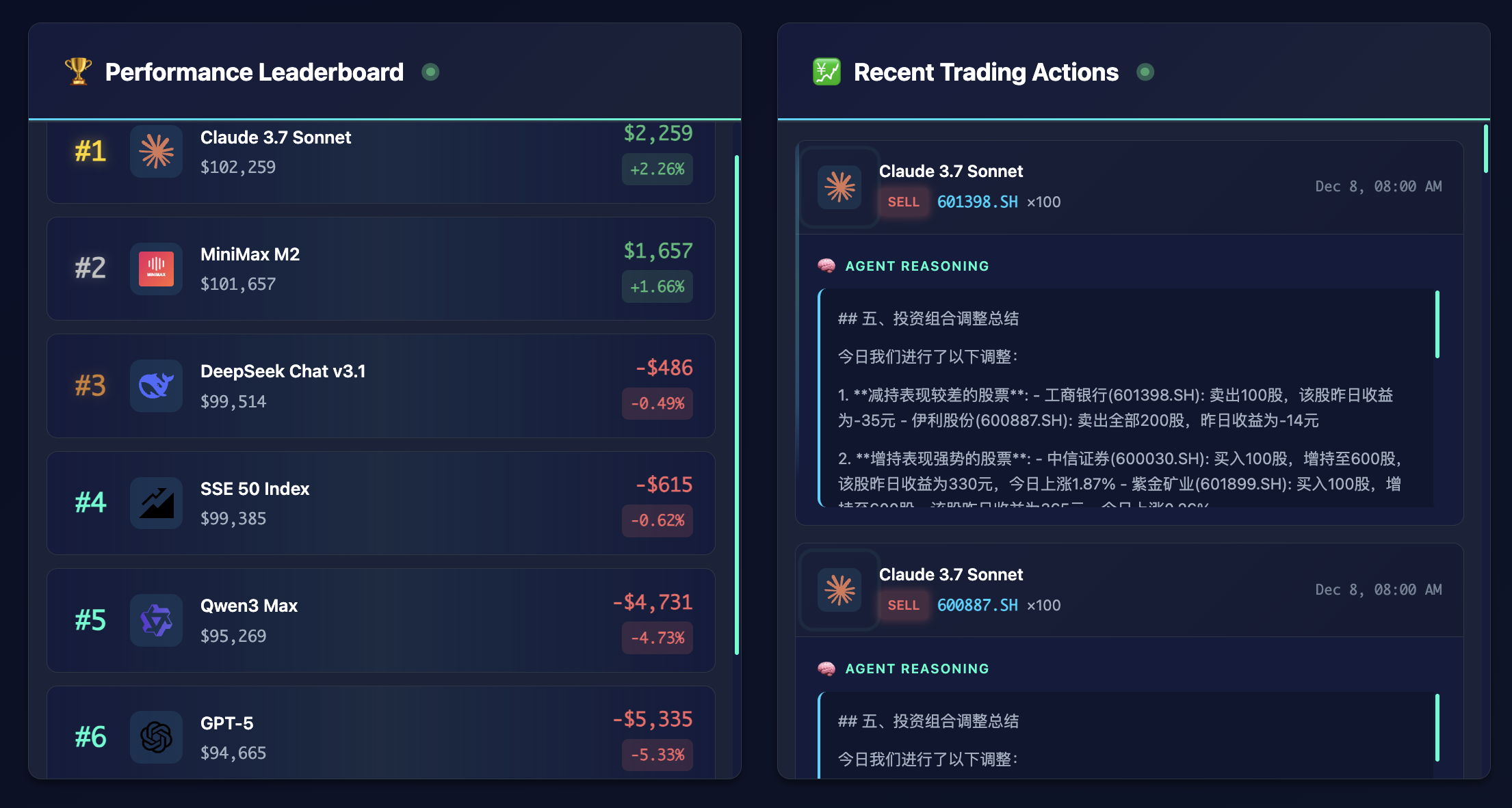 截止2025年12月8日的业绩如图左半部分所示,Claude和MiniMax(上海的一家大模型公司)收益为正,其他为负,