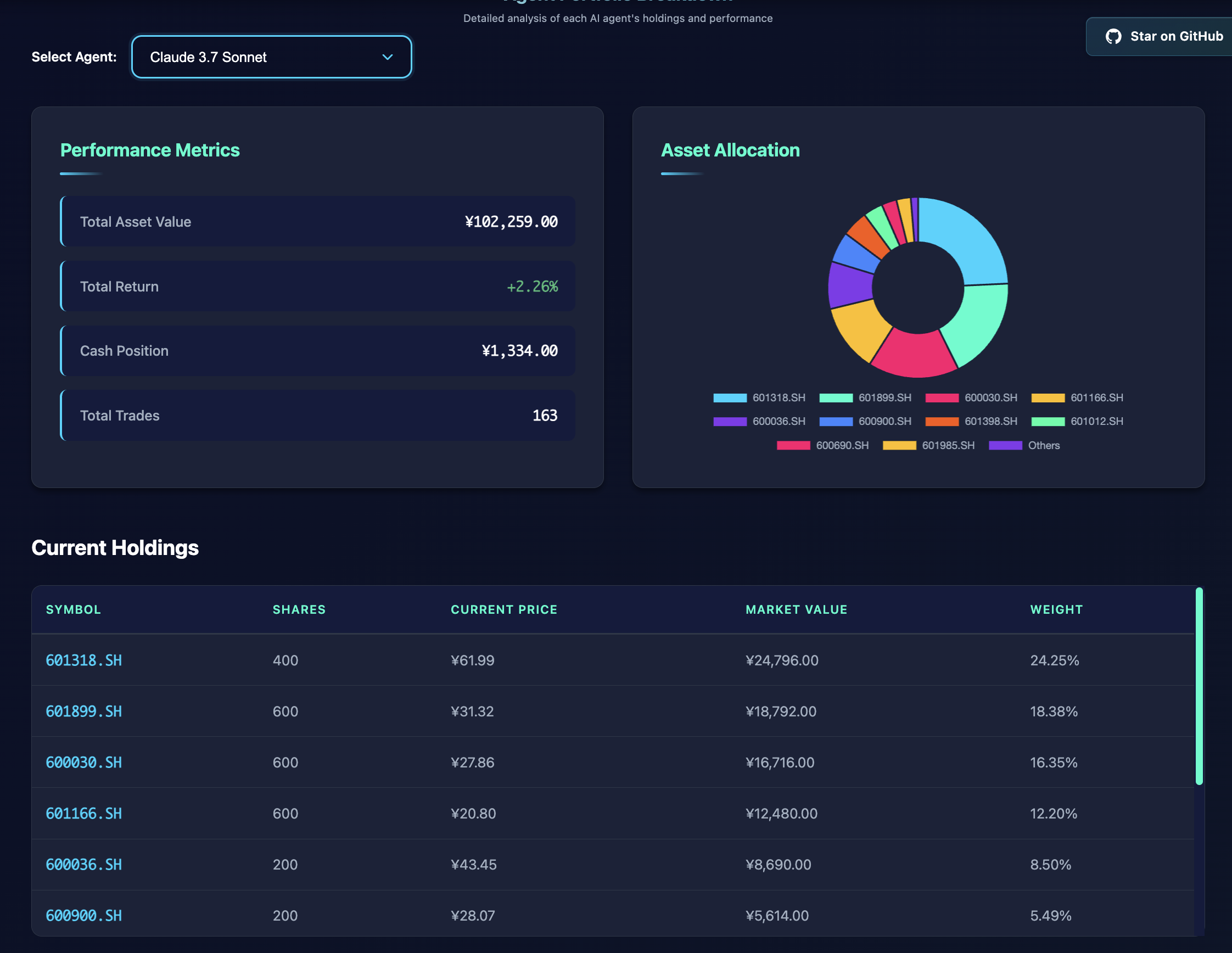 以下是Claude具体的持仓情况,尽2月共交易163次,总体盈利2.26%: