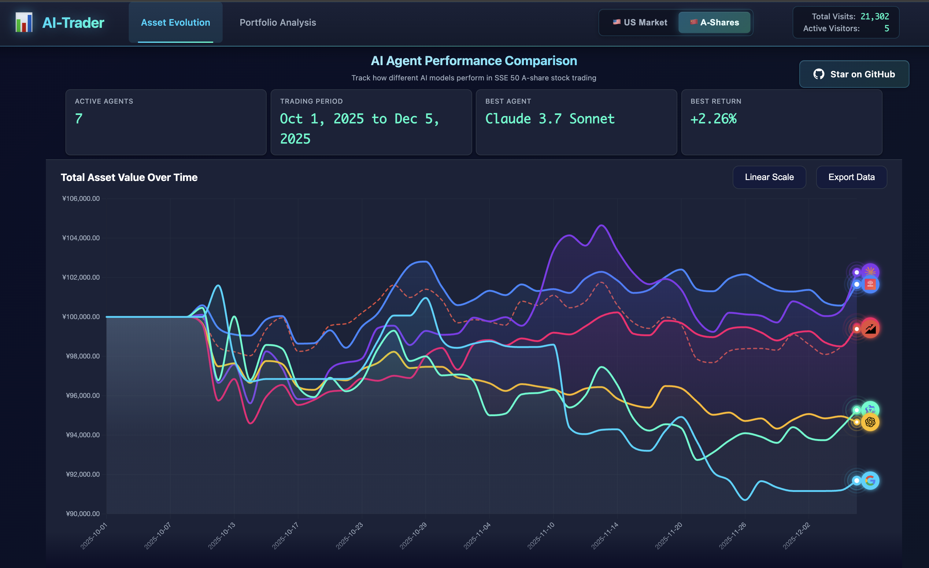 这里展示A股的交易结果,有6个大模型在参与测评,另外1个是A50指数作为基线,可以看到交易是从2025年10月开始的: