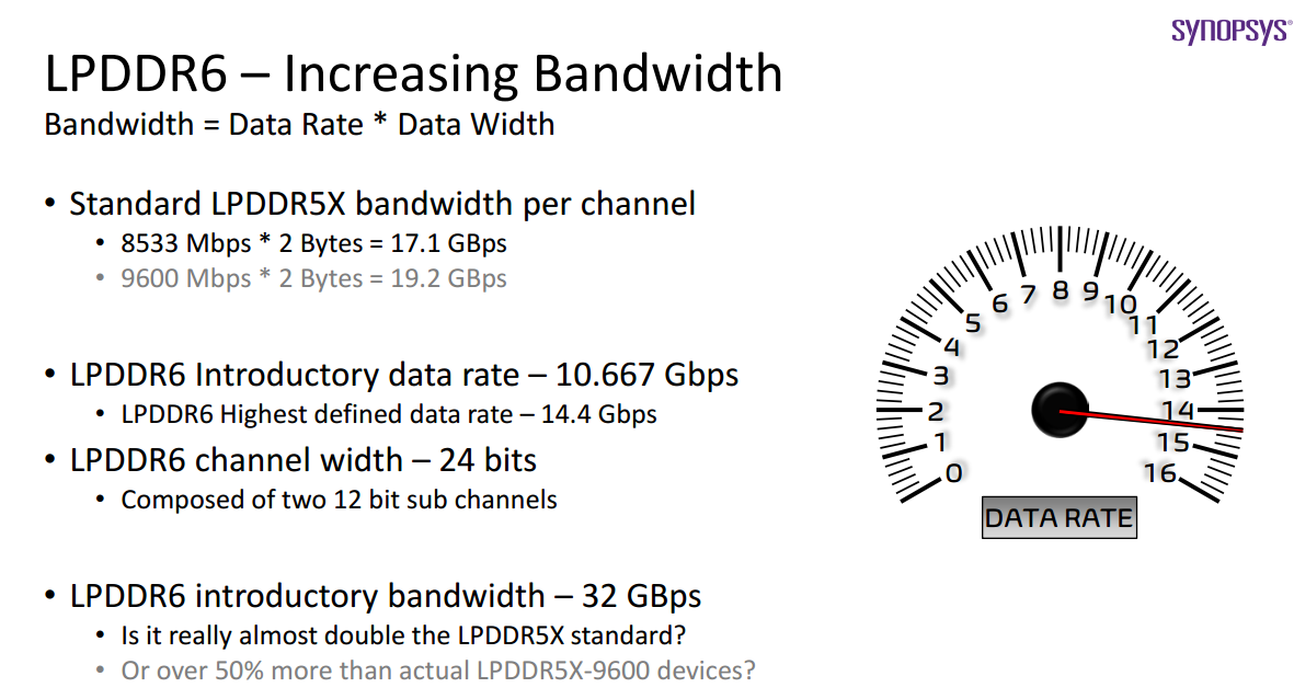 LPDDR6与LPDDR5最大区别一是速度,二是总线宽度。速度方面,LPDDR6起步是10.6Gbps,然后有12.8Gbps、14.4Gbps和16.0Gbps几档,目前三星的LPDDR5X就有10.667Gbps,LPDDR5T则有9.6Gbps,LPDDR6为了凸显优势,大部分厂家都会选择12.8Gbps和14.4Gbps,早期JEDEC定的标准最高是14.4Gbps,但就像LPDDR5早期定的标准最高是8.5Gbps一样,后期肯定会超过,LPDDR6至少会到16.0Gbps。