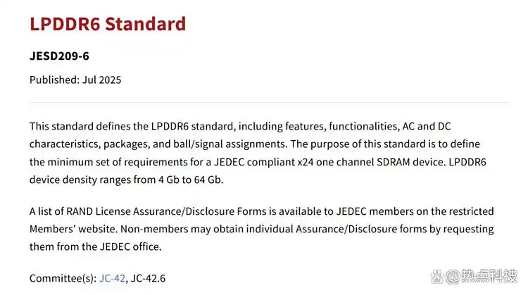 JEDEC今天正式发布了LPDDR6内存标准,规范编号JESD209-6,可显著提升移动设备、AI应用的性能、能效、安全。