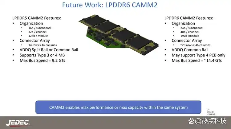 性能方面,LPDDR6采用双子通道架构,保持最小访问间隔32字节的同时,允许更灵活的操作。