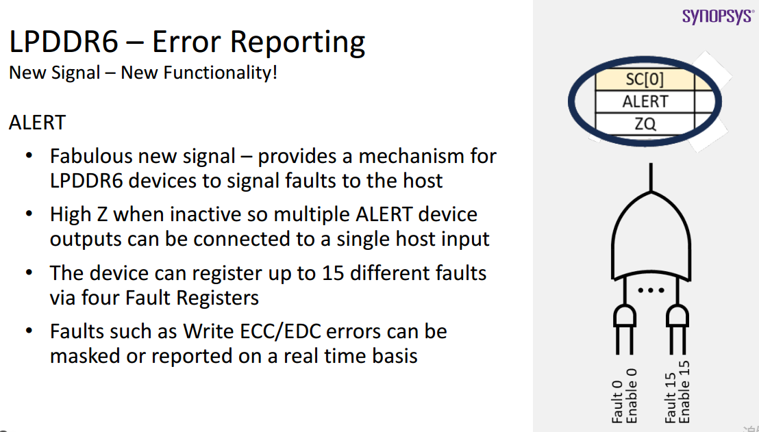 LPDDR6增加了ALERT信号,对Write Command下的ECC/EDC信息反查,支持通过4个fault寄存器确认16个不同Error。