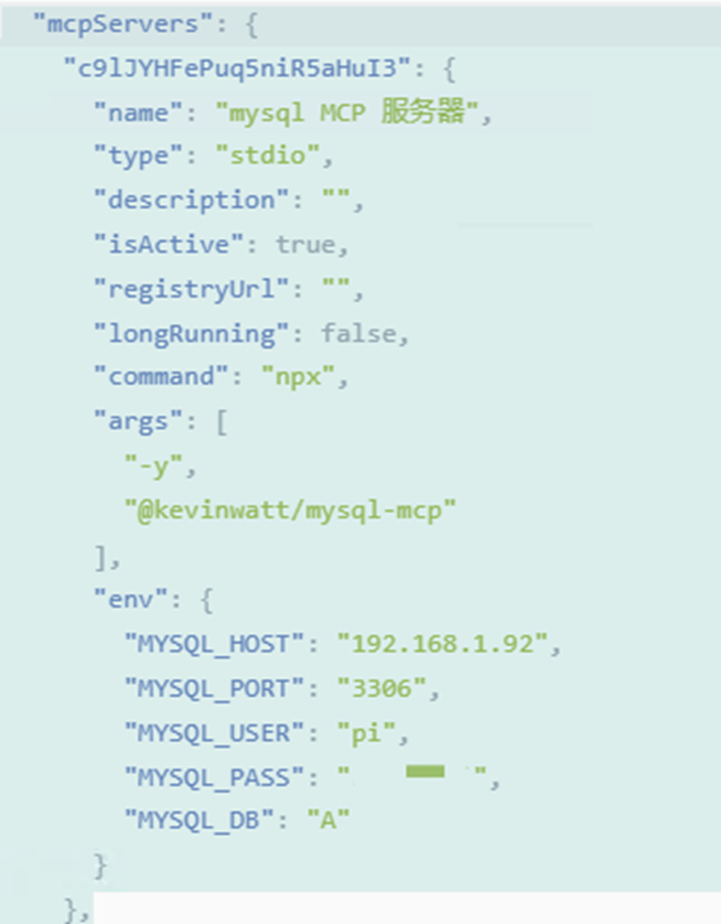 以一个mysql的mcp为例,在Cherry Studio中配置完成后长这个样子的(env的内容是服务器连接参数,请按实际来。另外配置的时候有UI界面可供选择,但我更喜欢直接贴json):