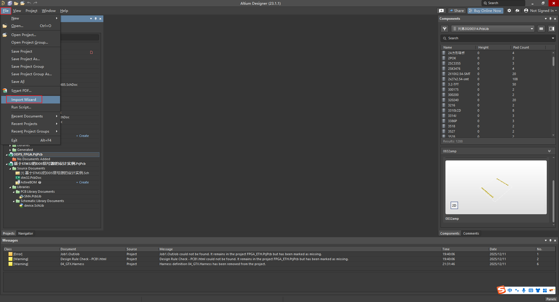 打开 Altium Designer,点击左上角菜单 File -> Import Wizard(导入向导)。