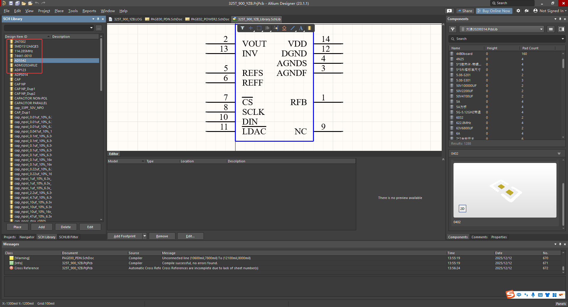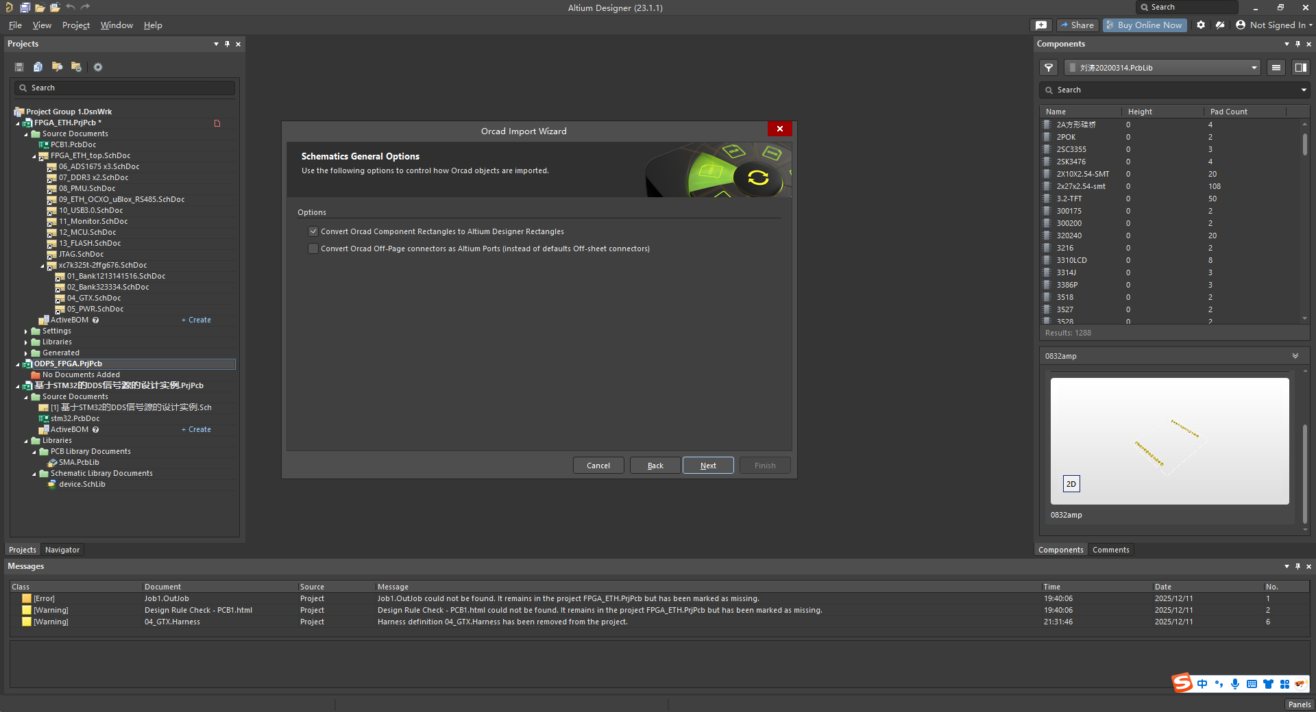 导入完成后,AD 左侧的 Projects 面板中会出现一个新的工程 (.PrjPcb),里面包含了转换好的原理图文件 (.SchDoc)。到这里就有了原理图库了,如下图所示: