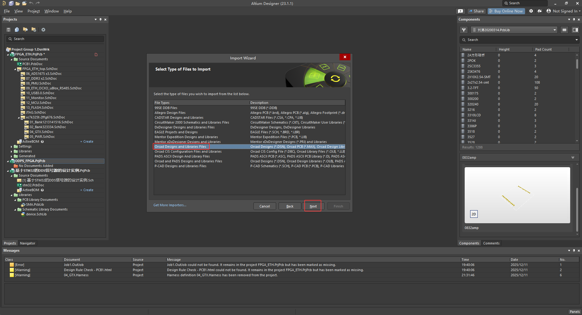 在 "Select Type of Files to Import" 列表中,找到并选择 OrCAD Designs and Libraries Files(注意:不要选成 Allegro Design Files,那是转 PCB 的)。点击 Next。