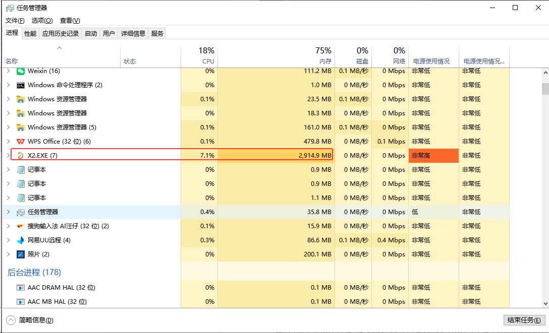 判断是否卡住,可以打开任务管理器来看消耗的内存是否在跳动,在跳动说明没有卡住,不跳动则卡住,如下: