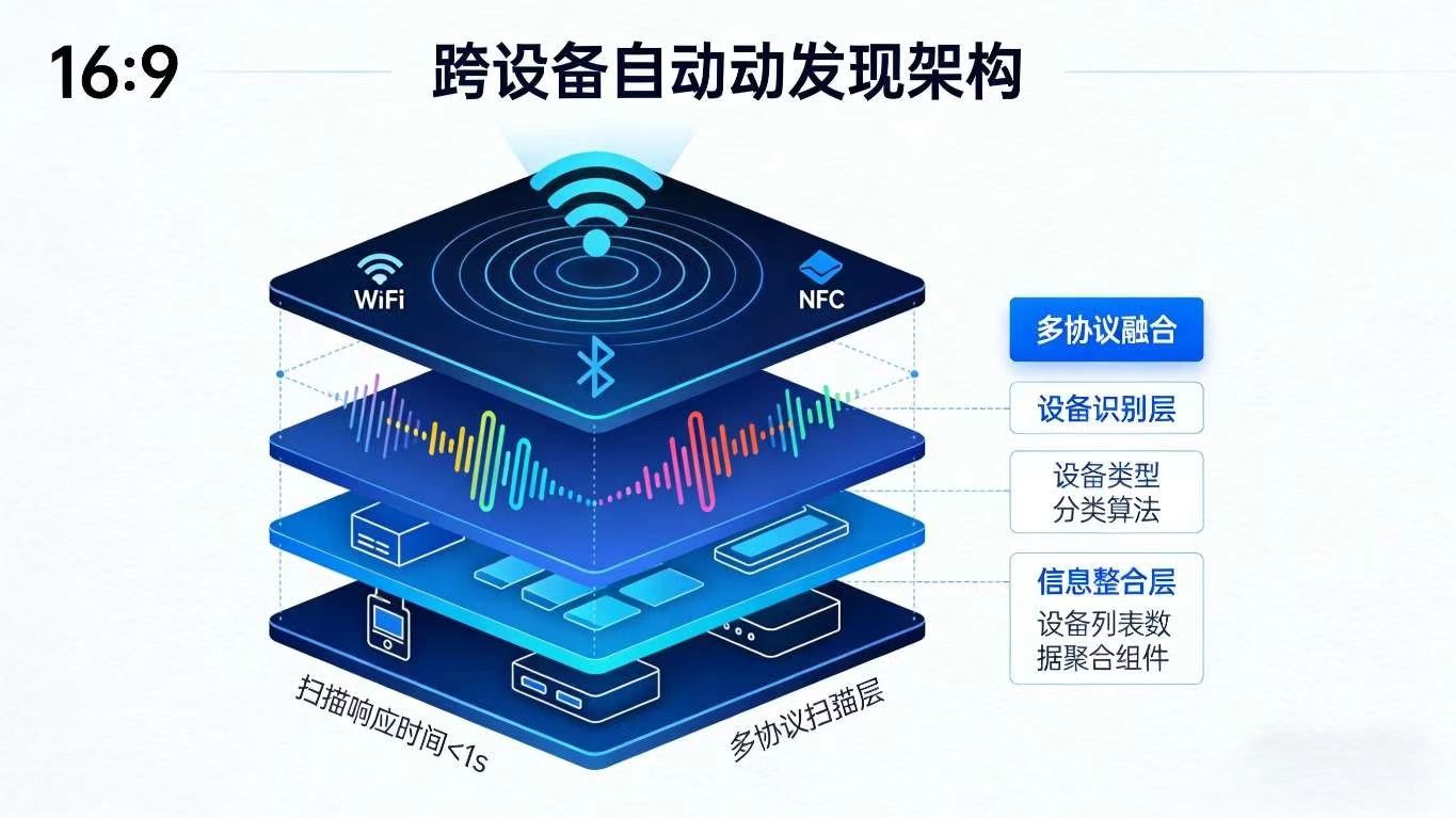 用户打开手机端分布式应用,应用自动启动多协议扫描,发现同一局域网内的平板、智慧屏、智能音箱等设备,在 UI 界面展示设备名称、类型、在线状态等信息,无需用户手动搜索。