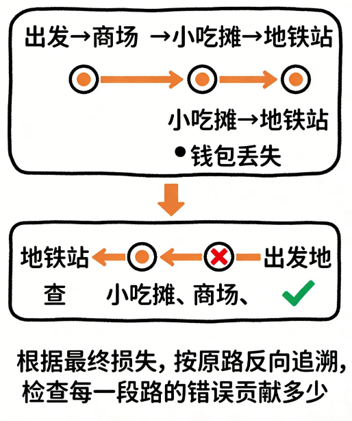 根据最终的损失,按路径逐层倒推,检查每一层对错误的贡献是多少。