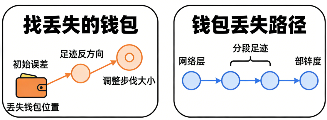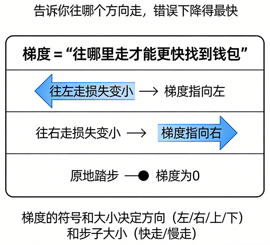 👜 三、类比:梯度下降 = "逆着脚印找钱包"