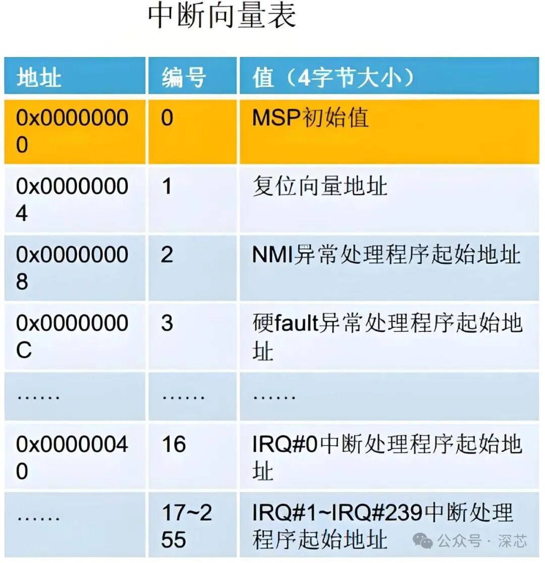 CPU从启动介质指定的起始地址(复位向量地址)获取中断向量表。向量表是一个存储异常处理程序入口地址的数组,其中最关键的两个条目是: