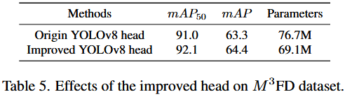 WaveMamba 利用 DWT 将特征分解为低频与三类高频子带,并通过**WaveMamba Fusion Block (WMFB)**进行跨模态融合。其中,LMFB 结合 Mamba 建模低频全局结构,HFE 则通过"绝对值最大"规则选择关键高频细节。此外,论文对 YOLOv8 的检测头进行改造,引入 IDWT 作为上采样方式,实现更少信息损失的输出。