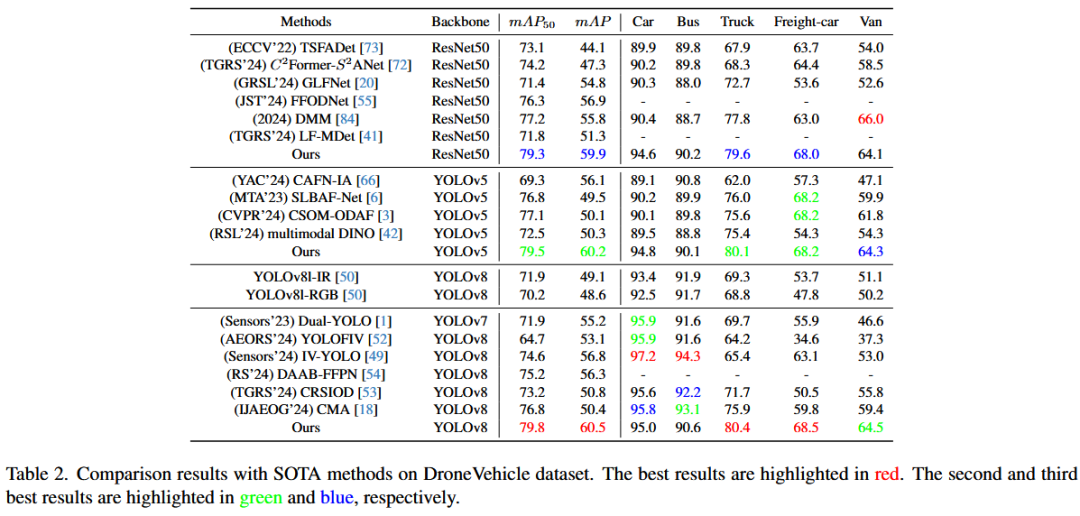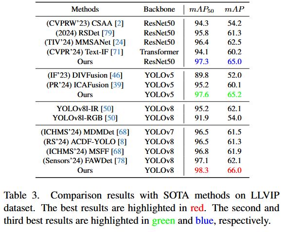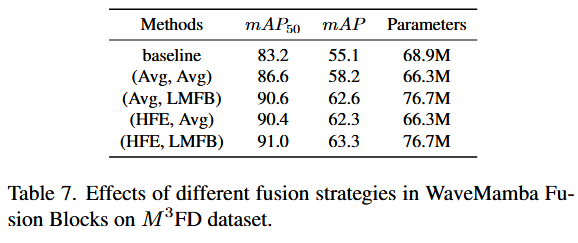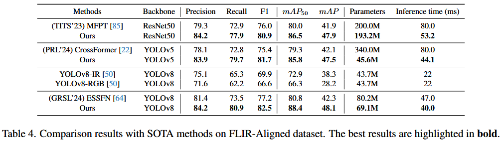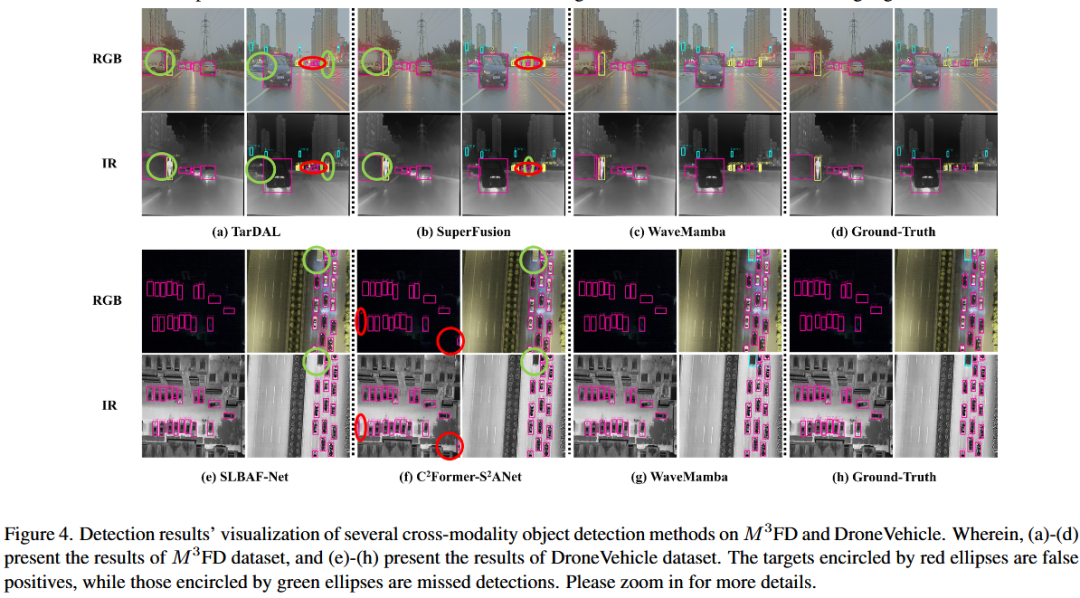 实验表明:WaveMamba 在 M3FD、DroneVehicle、LLVIP、FLIR-Aligned 四个公开 RGB-IR 数据集上均取得了显著性能提升,平均 mAP 超越第二名方法 4.5%,在复杂天气、极暗光、小目标场景表现尤为突出。