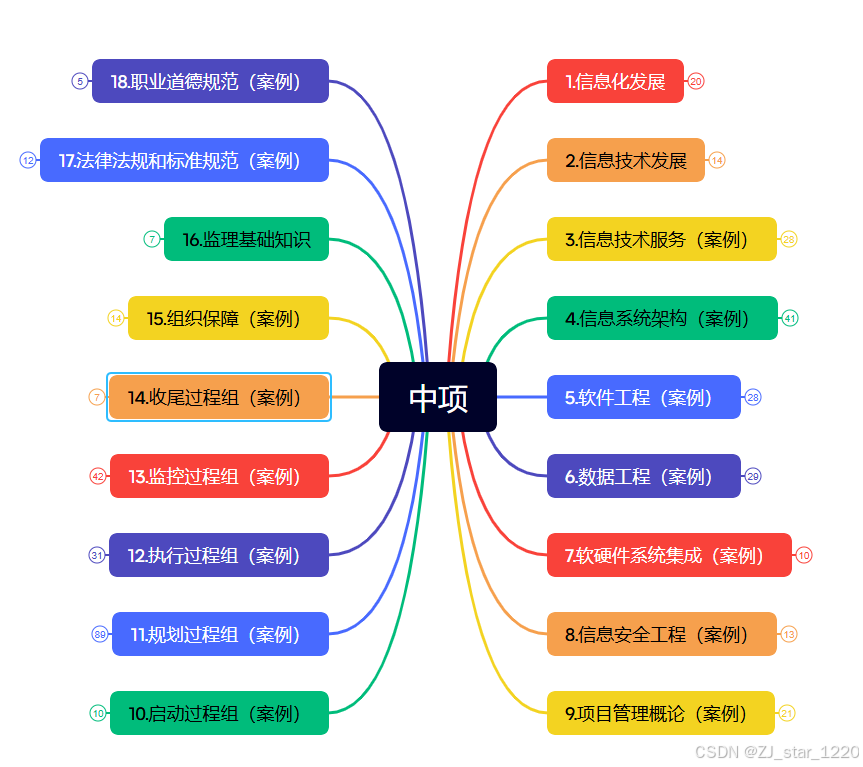学习之前大家心里要有个数,系统集成项目管理从第九章到第十六章都是项目管理相关的知识,这部分的内容知识点占了80%,考试分数也占了80%,根据二八法则,大家一定要多花时间在这个上面,其他章节的内容,17、18章的法律道德最多考2分而且靠常识基本上也能蒙对、前面8章的技术部分可能选择题有10-20分的考点,大家做一两遍题目有个印象就好了,最后就是英文题目一共就5分直接交给上天吧,没必要死磕。建议大家考试之前都下载一份考试大纲看一遍。