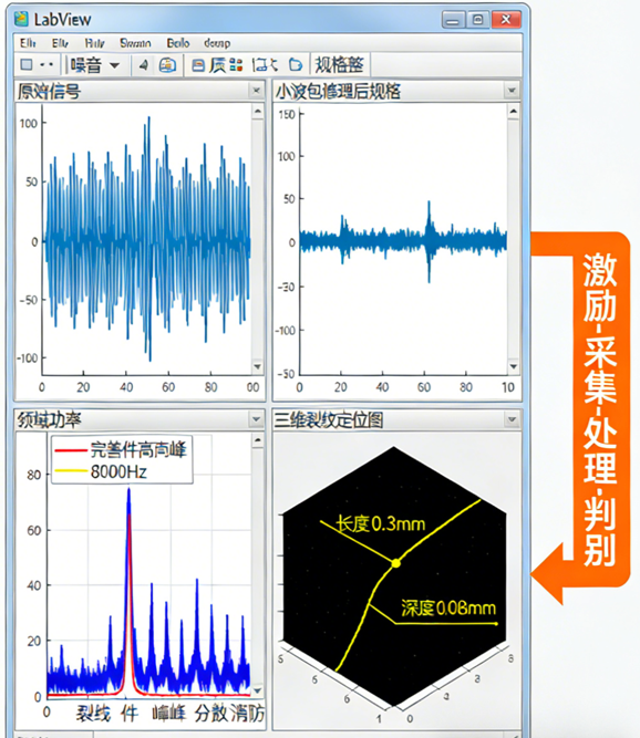 LabVIEW 作为图形化虚拟仪器开发平台,具备强大的多通道信号同步采集、实时处理与数据分析能力。其内置的 DAQmx 驱动可无缝对接多种声学传感器,实现高频声学信号的精准采集;集成的数字滤波、傅里叶变换、小波分析等算法模块,能高效剔除环境噪声与设备干扰,提取裂纹特征信号;支持自定义人机交互界面,可实时展示信号波形、频谱分布、裂纹定位结果等关键信息,同时具备数据存储、报表生成与历史追溯功能,为检测数据的后续分析提供便利。