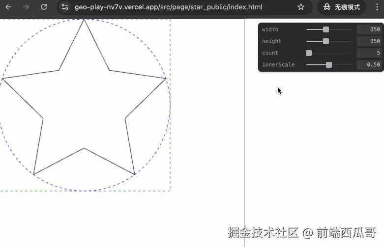 到这里我们绘制了一个 2x2 圆的内接星形。(到这里才发现 1x1 要传入 0.5 或者改多边形算法实现才行,想了下 2x2 也问题不大)